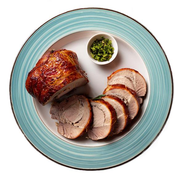Placer porchettaen på en rist med en gastrobakke under og steg den midt i ovnen ved 170°C i 1 ½ time. (lidt afhængig af størrelsen på boven/slaget) Vend stegen nogle gange undervejs, så den får en pæn sprød stegeflade hele vejen rundt. Alternativt kan porchettaen grilles ved indirekte varme på rotisseri ved 180°C.