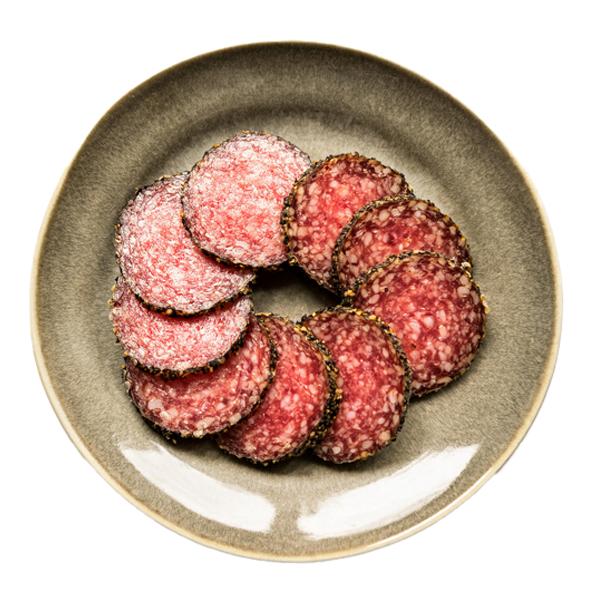 Det frosne spæk kommes i lynhakkeren, køres ned til ca. 4-5 mm størrelse. Herefter tilsættes det skalfrosne okse og svinekød, samt krydderier og starterkultur. Der køres til den ønskede grovhed er opnået. Salt tilsættes og køres med de sidste 5-8 omgange.