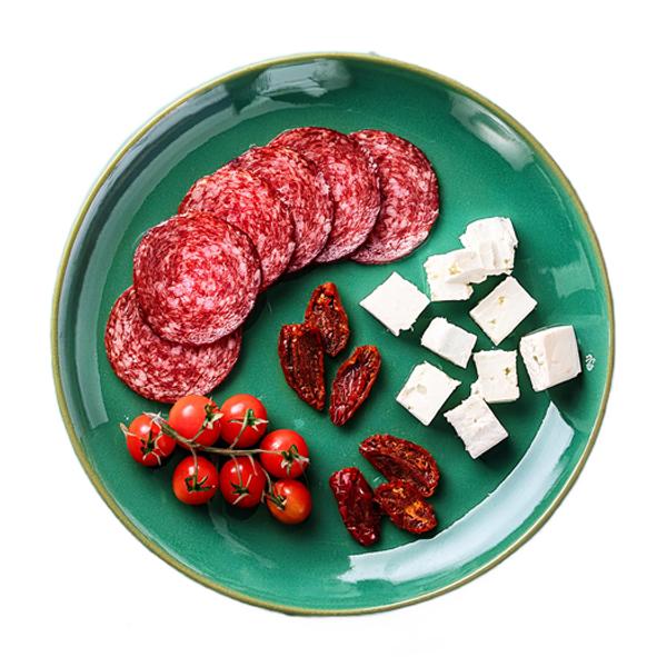 Spegepølse med salatost i tern, oliven og soltørret tomat