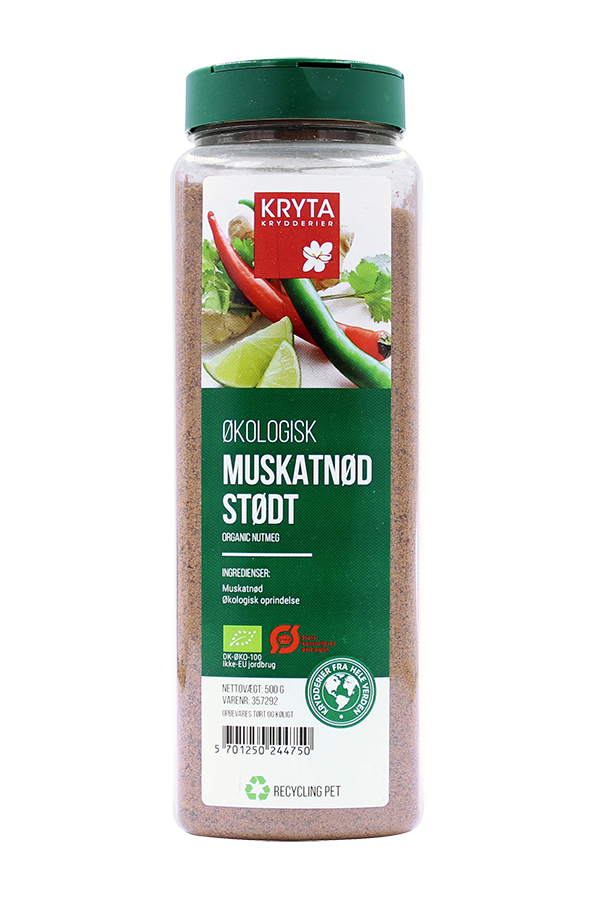Stødt muskatnød er et velegnet krydderi til osteretter, mælkesaucer, farsretter, og i pølser osv.