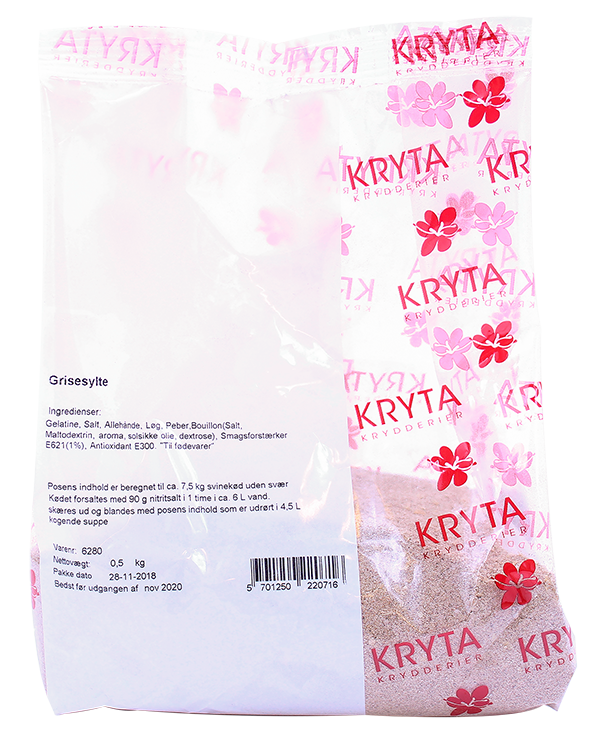 Færdigblanding til sylte med bl.a. gelatine, peber og løg. Posens indhold passer til 7,5 kg svinekød uden svær.