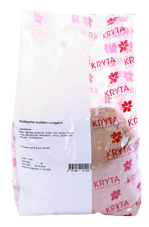 Lynggård rullepølsekrydderi med bl.a. peber, sennep og allehånde.