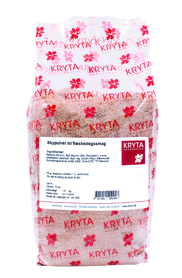 Pulver til fremstilling af pålægssky med flæskestegssmag - tilsat farve. 70 g skypulver udrøres i 1 ltr. varmt vand.