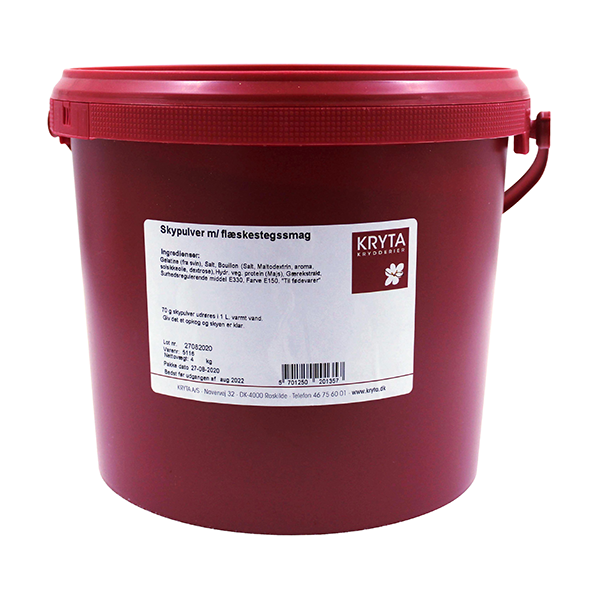 Pulver til fremstilling af pålægssky med flæskestegssmag - tilsat farve. 70 g skypulver udrøres i 1 ltr. varmt vand.