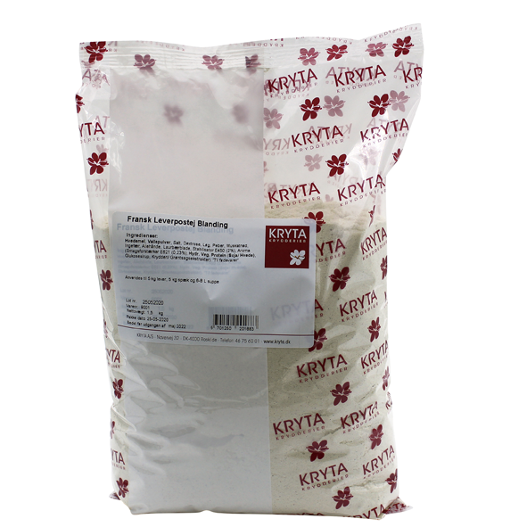 Færdigblanding til fransk leverpostej med cremet konsistens og delikat smag af løg og peber. Posens indhold anvendes til 5 kg lever, 5 kg spæk og 6-8 ltr. suppe.