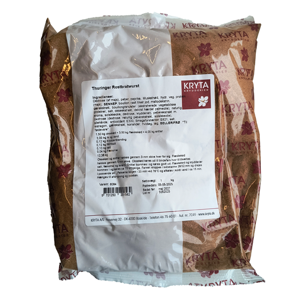 1,50 kg oksekød3,50 kg flæskekød3,00 kg is og vand0,12 kg Thüringer Bratwurst0,12 kg nitritsalt0,10 kg salt0,04 kg Fænomal12,38 kg